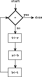 In order for the data paths to actually compute GCDs, the buttons must be pushed in the correct sequence. We will describe this sequence in terms of a controller diagram, as illustrated in figure 5.2. The elements of the controller diagram indicate how the data-path components should be operated. The rectangular boxes in the controller diagram identify data-path buttons to be pushed, and the arrows describe the sequencing from one step to the next. The diamond in the diagram represents a decision. One of the two sequencing arrows will be followed, depending on the value of the data-path test identified in the diamond. We can interpret the controller in terms of a physical analogy: Think of the diagram as a maze in which a marble is rolling. When the marble rolls into a box, it pushes the data-path button that is named by the box. When the marble rolls into a decision node (such as the test for b = 0), it leaves the node on the path determined by the result of the indicated test. Taken together, the data paths and the controller completely describe a machine for computing GCDs. We start the controller (the rolling marble) at the place marked start, after placing numbers in registers a and b. When the controller reaches done, we will find the value of the GCD in register a.