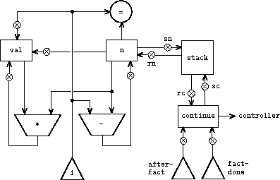 With the aid of the stack, we can reuse a single copy of the factorial machine's data paths for each factorial subproblem. There is a similar design issue in reusing the controller sequence that operates the data paths. To reexecute the factorial computation, the controller cannot simply loop back to the beginning, as with an iterative process, because after solving the (n - 1)! subproblem the machine must still multiply the result by n. The controller must suspend its computation of n!, solve the (n - 1)! subproblem, then continue its computation of n!. This view of the factorial computation suggests the use of the subroutine mechanism described in section 5.1.3, which has the controller use a continue register to transfer to the part of the sequence that solves a subproblem and then continue where it left off on the main problem. We can thus make a factorial subroutine that returns to the entry point stored in the continue register. Around each subroutine call, we save and restore continue just as we do the n register, since each "level" of the factorial computation will use the same continue register. That is, the factorial subroutine must put a new value in continue when it calls itself for a subproblem, but it will need the old value in order to return to the place that called it to solve a subproblem.