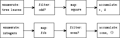 Now we can reformulate sum-odd-squares and even-fibs as in the signal-flow diagrams. For sum-odd-squares, we enumerate the sequence of leaves of the tree, filter this to keep only the odd numbers in the sequence, square each element, and sum the results: