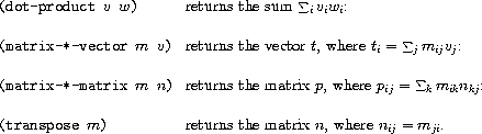 is represented as the sequence ((1 2 3 4) (4 5 6 6) (6 7 8 9)). With this representation, we can use sequence operations to concisely express the basic matrix and vector operations. These operations (which are described in any book on matrix algebra) are the following: