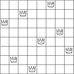 The "eight-queens puzzle" asks how to place eight queens on a chessboard so that no queen is in check from any other (i.e., no two queens are in the same row, column, or diagonal). One possible solution is shown in figure 2.8. One way to solve the puzzle is to work across the board, placing a queen in each column. Once we have placed k - 1 queens, we must place the kth queen in a position where it does not check any of the queens already on the board. We can formulate this approach recursively: Assume that we have already generated the sequence of all possible ways to place k - 1 queens in the first k - 1 columns of the board. For each of these ways, generate an extended set of positions by placing a queen in each row of the kth column. Now filter these, keeping only the positions for which the queen in the kth column is safe with respect to the other queens. This produces the sequence of all ways to place k queens in the first k columns. By continuing this process, we will produce not only one solution, but all solutions to the puzzle.