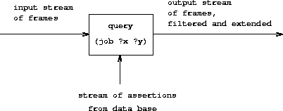 In our system, a query takes an input stream of frames and performs the above matching operation for every frame in the stream, as indicated in figure 4.4. That is, for each frame in the input stream, the query generates a new stream consisting of all extensions to that frame by matches to assertions in the data base. All these streams are then combined to form one huge stream, which contains all possible extensions of every frame in the input stream. This stream is the output of the query.