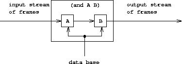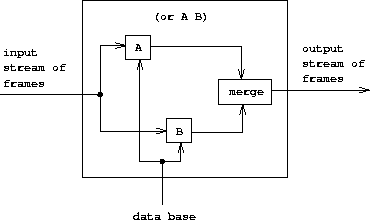 Figure 4.6 shows the analogous method for computing the or of two queries as a parallel combination of the two component queries. The input stream of frames is extended separately by each query. The two resulting streams are then merged to produce the final output stream.