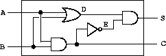 We can connect primitive functions together to construct more complex functions. To accomplish this we wire the outputs of some function boxes to the inputs of other function boxes. For example, the half-adder circuit shown in figure 3.25 consists of an or-gate, two and-gates, and an inverter. It takes two input signals, A and B, and has two output signals, S and C. S will become 1 whenever precisely one of A and B is 1, and C will become 1 whenever A and B are both 1. We can see from the figure that, because of the delays involved, the outputs may be generated at different times. Many of the difficulties in the design of digital circuits arise from this fact.